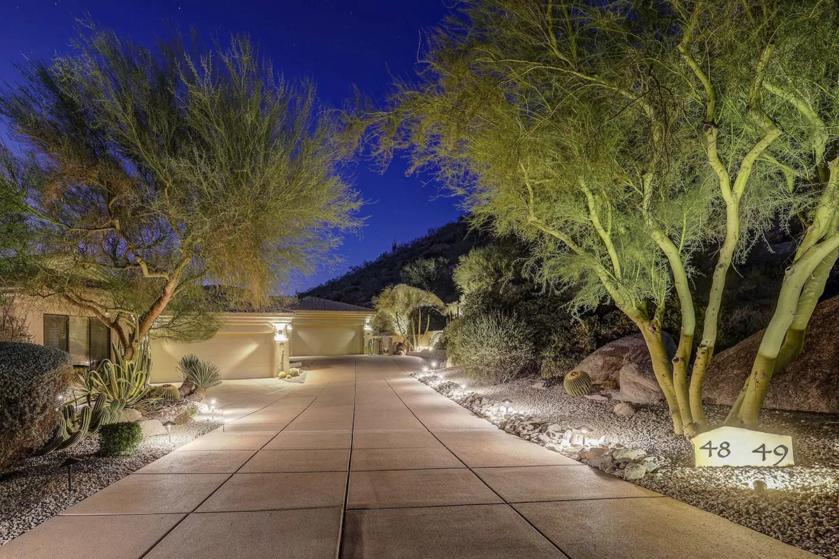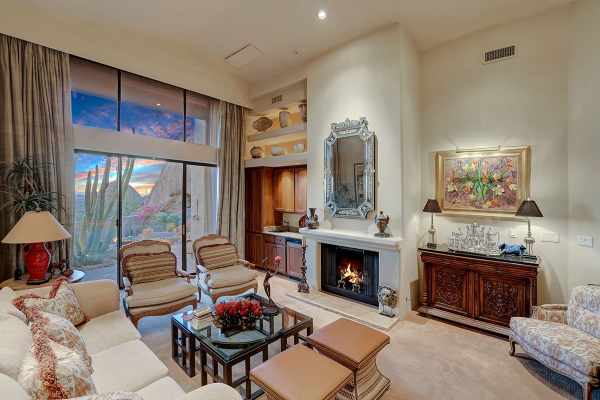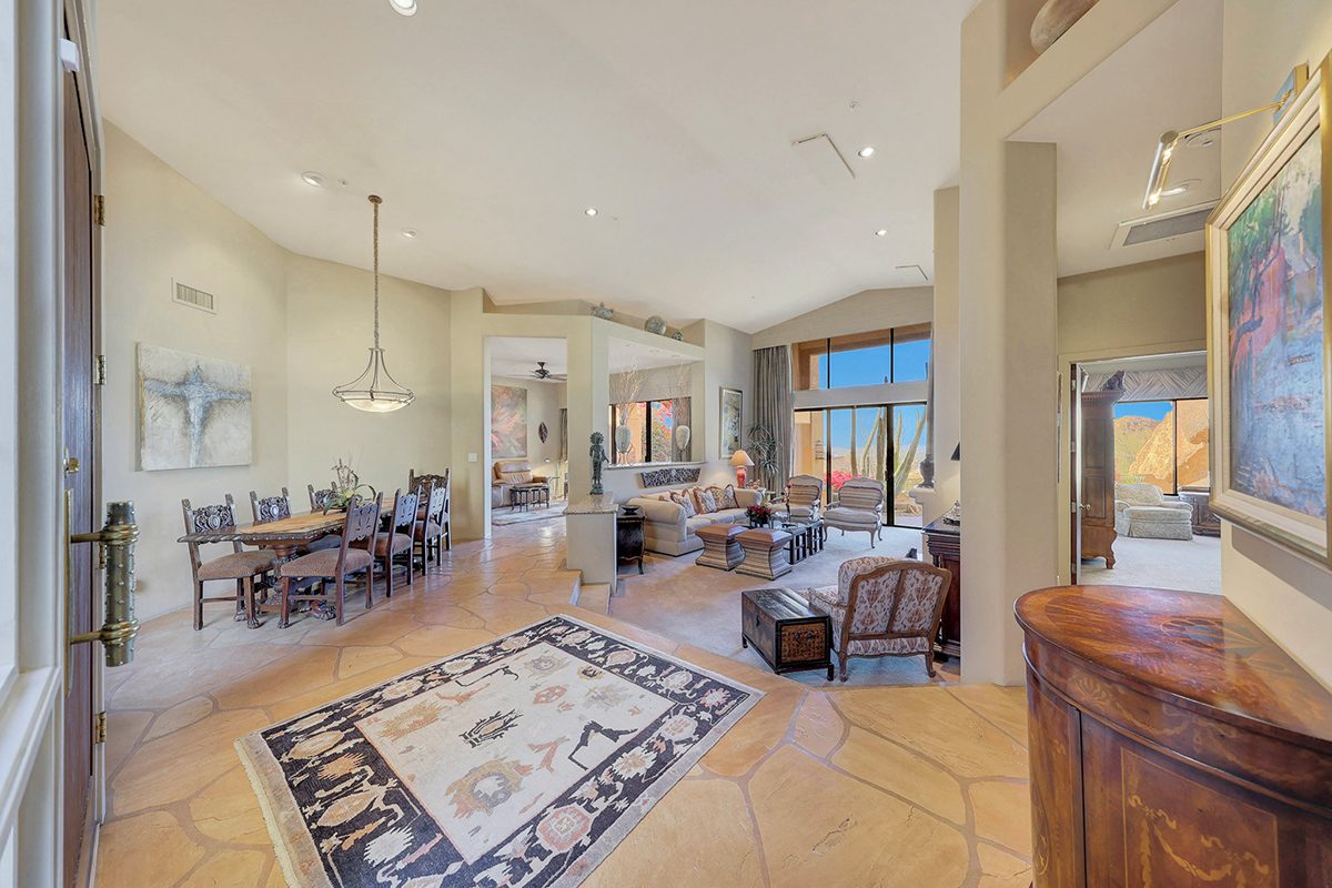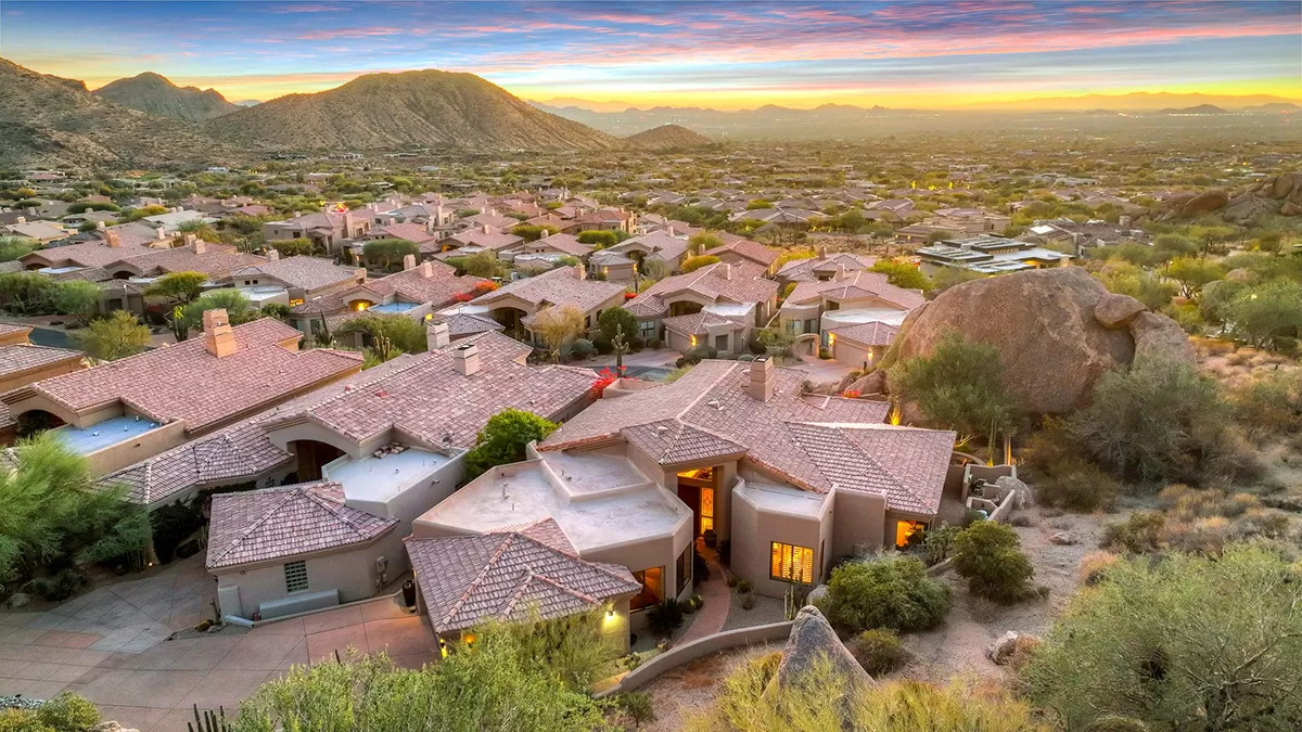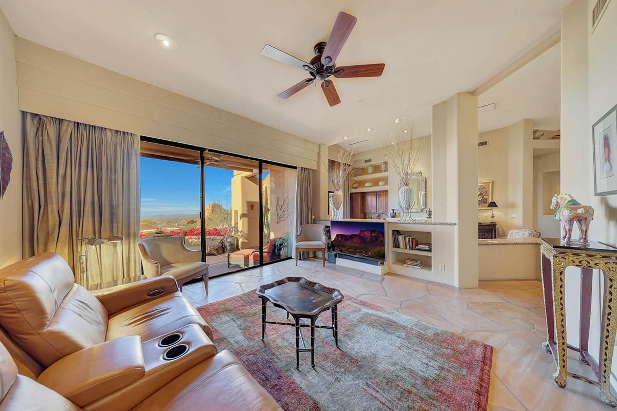 At the top of the hillside, experience unparalleled views and luxurious living in the gated community of Whispering Ridge at Troon Village. Situated on the south side of Troon Mountain, this exclusive homesite offers privacy and stunning mountain and city light views. This 2,943 sq. ft. home is perfectly positioned at the end of a cul-de-sac and near the community pool and spa. Nestled against a backdrop of dramatic boulder outcroppings and protected NAOS land, the property has some of the best views in the area.
