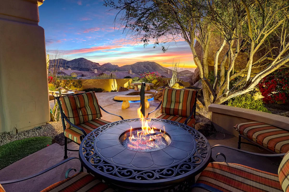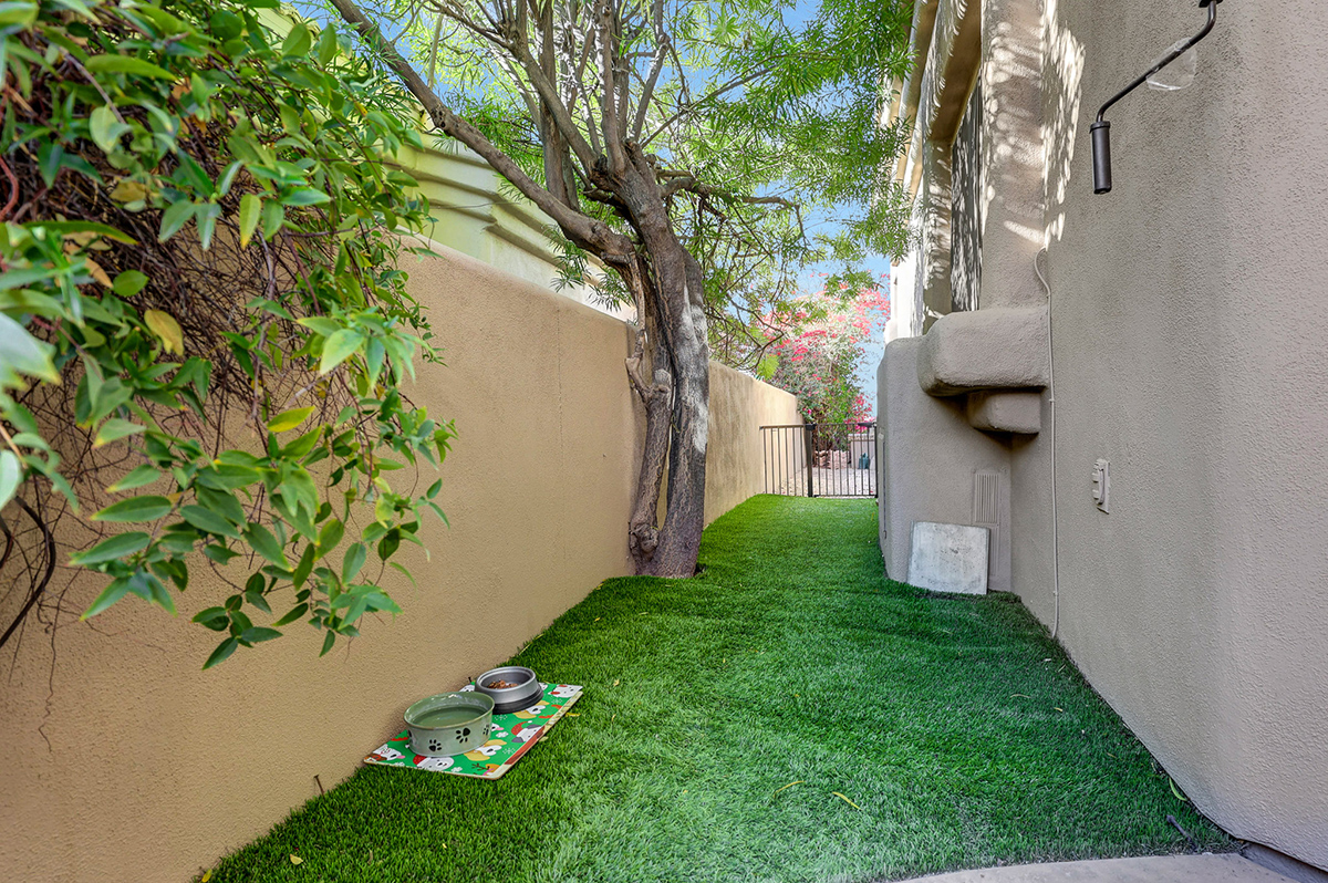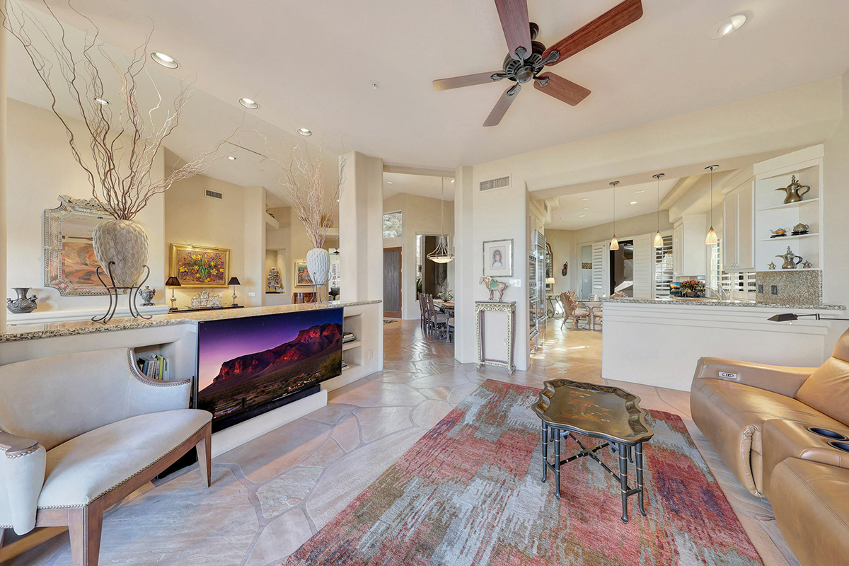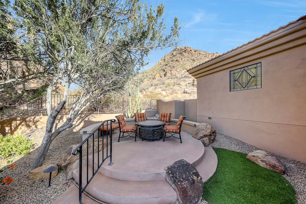 The backyard is an entertainer’s dream, featuring a spa, a fire pit, and multiple covered and uncovered patio spaces, including one with a motorized awning. A gated dog run with artificial turf adds to the charm. A large shared driveway extends along Troon Mountain to a two-car garage complete with epoxy floors, an insulated door, and built-in cabinetry.
