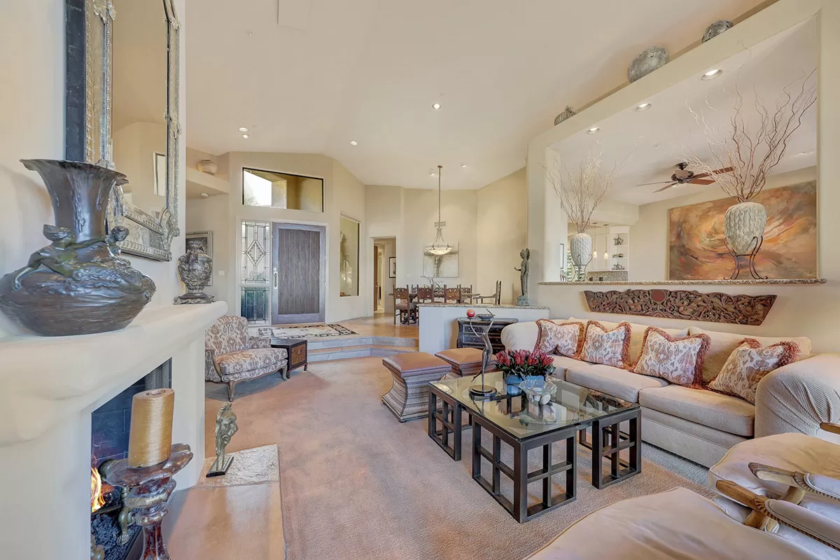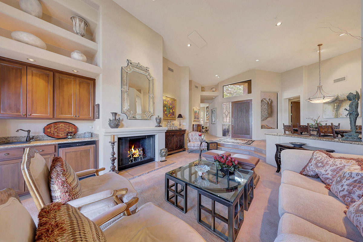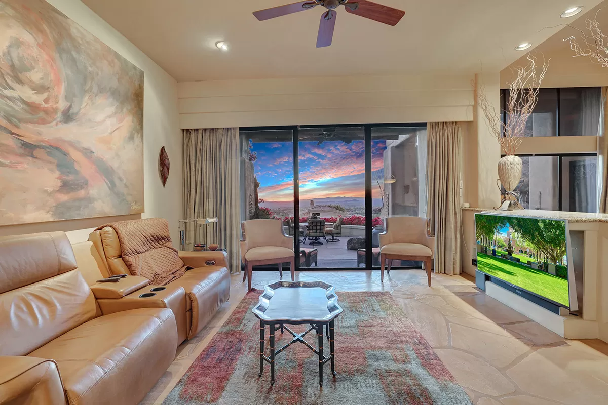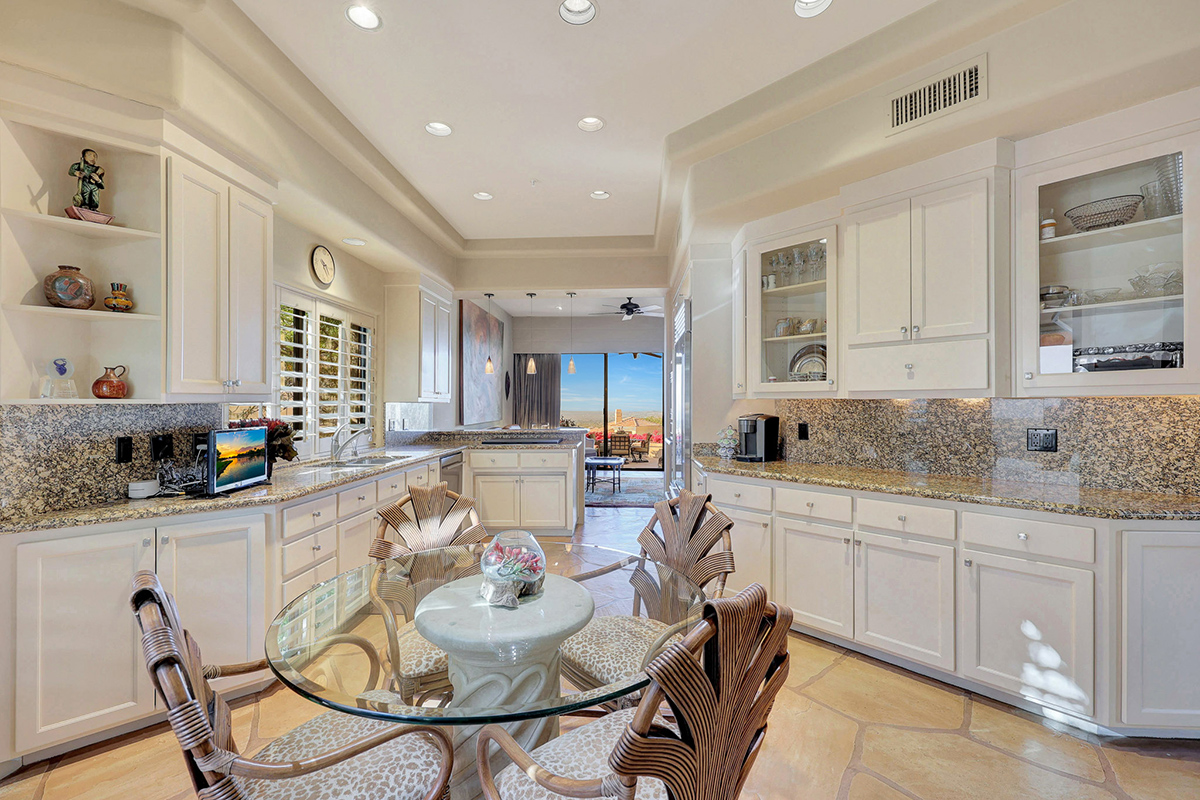 The backyard is an entertainer’s dream, featuring a spa, a fire pit, and multiple covered and uncovered patio spaces, including one with a motorized awning. A gated dog run with artificial turf adds to the charm. A large shared driveway extends along Troon Mountain to a two-car garage complete with epoxy floors, an insulated door, and built-in cabinetry.