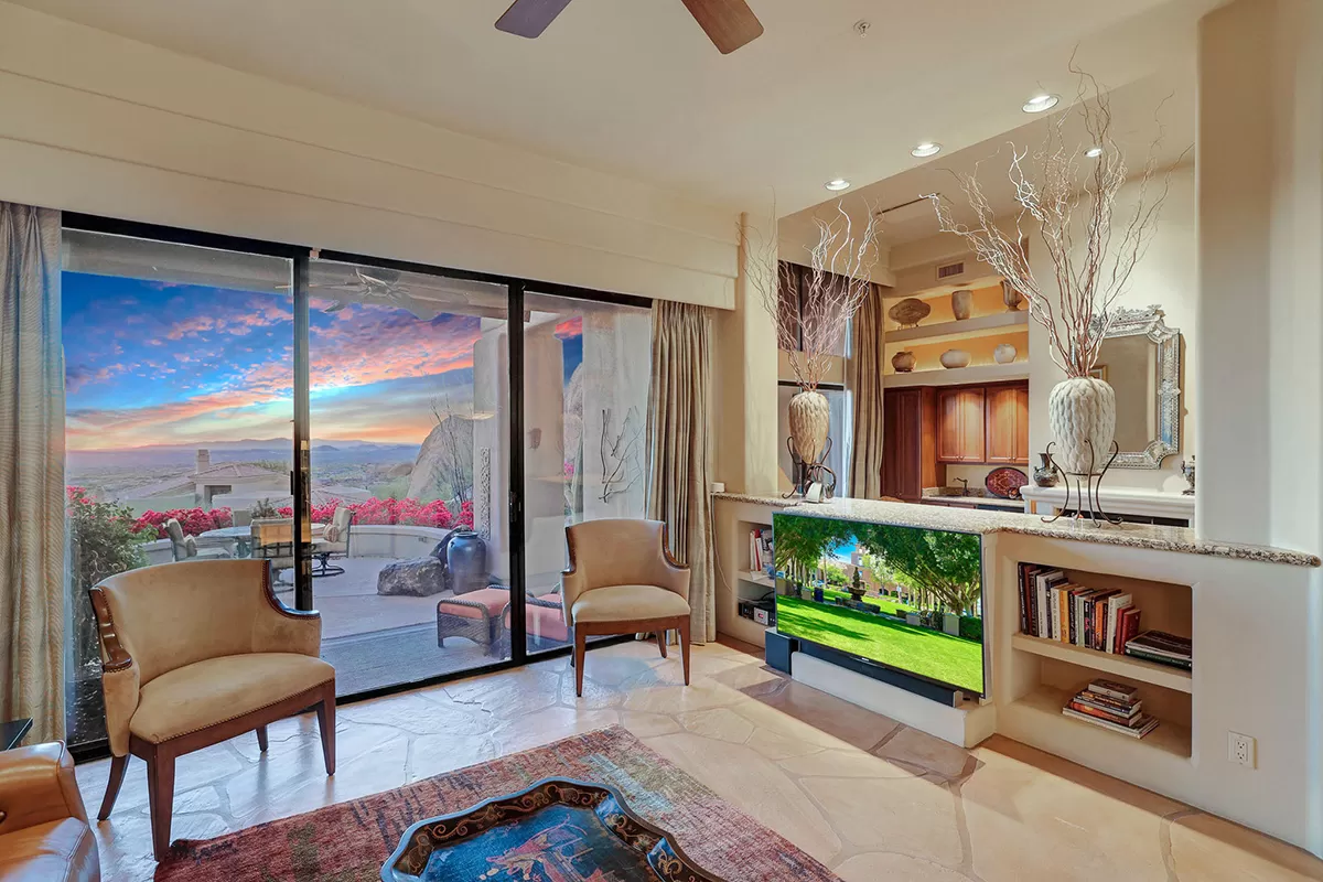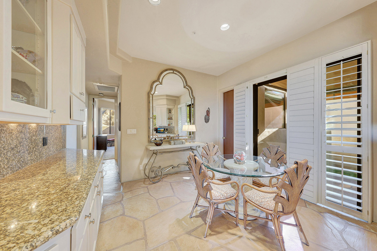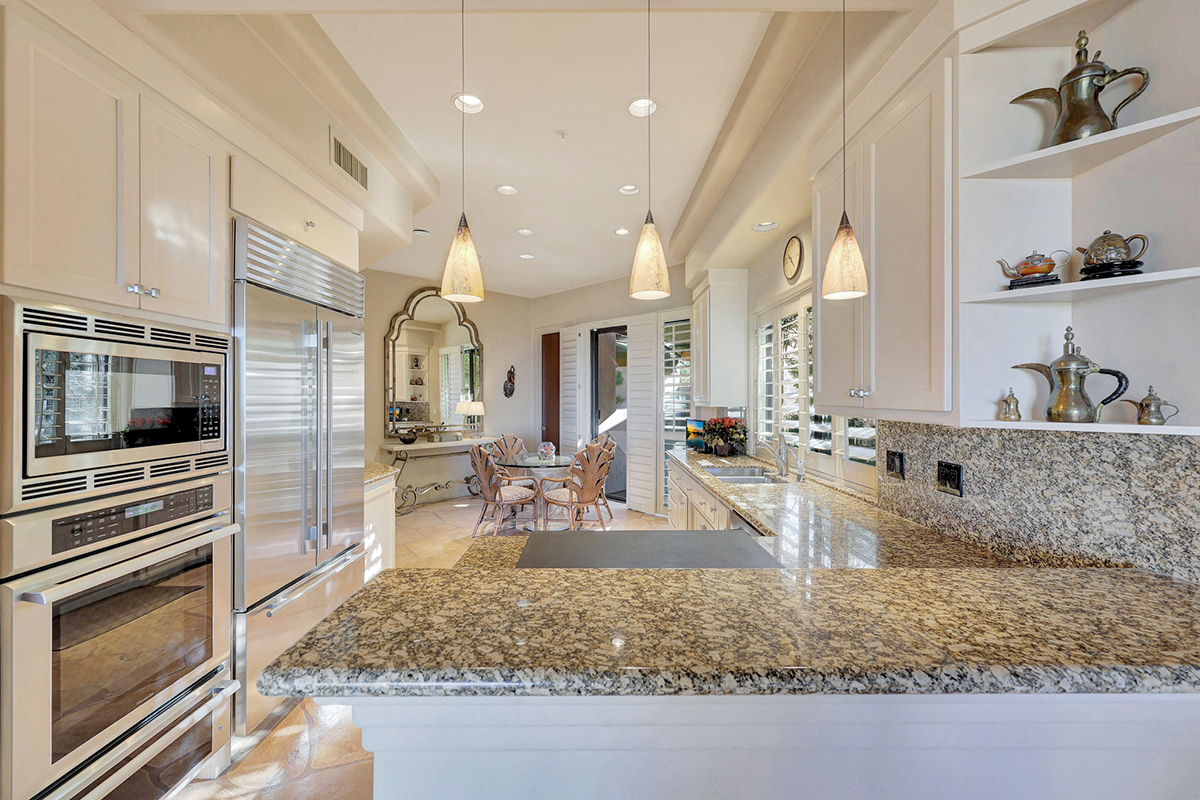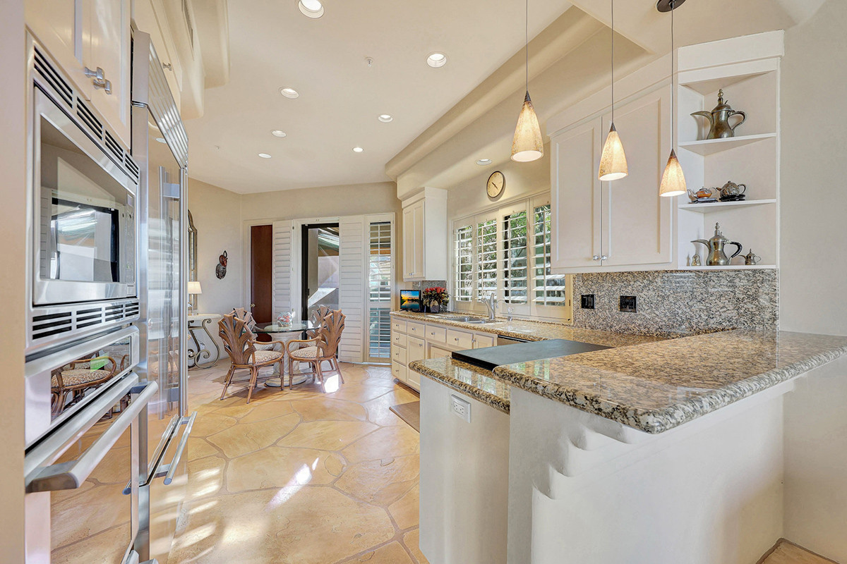 Inside, the home offers three bedrooms plus an office/music room, three bathrooms, and spacious living, family, and dining areas. The foyer opens to a living room with floor-to-ceiling windows that frame breathtaking views, complemented by a centerpiece fireplace. The remodeled kitchen includes new stainless steel appliances, a Subzero refrigerator, painted white cabinetry, granite countertops, and a charming breakfast nook with private patio access.