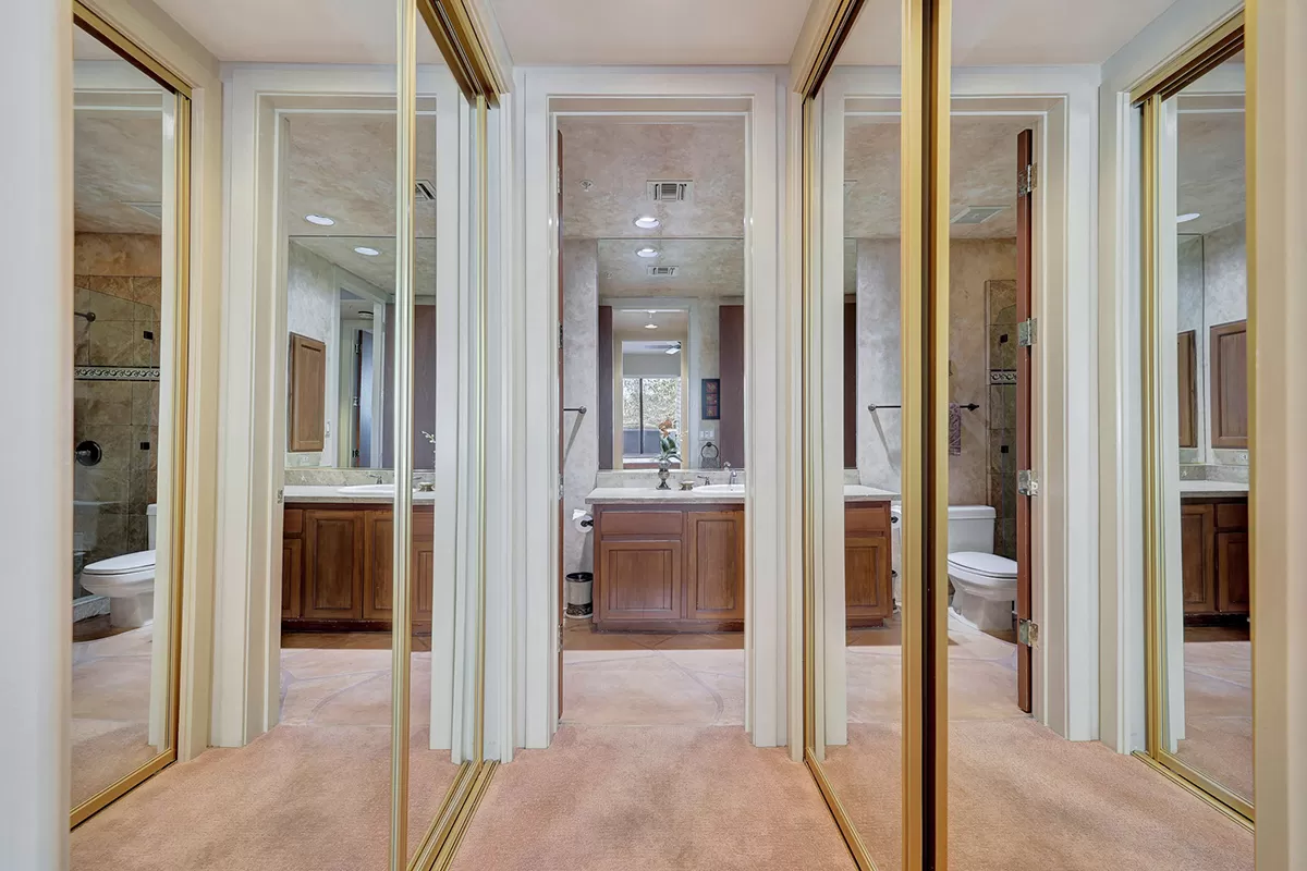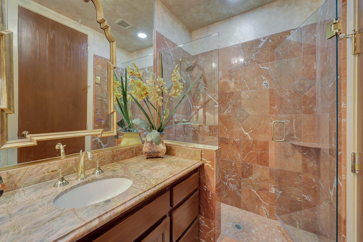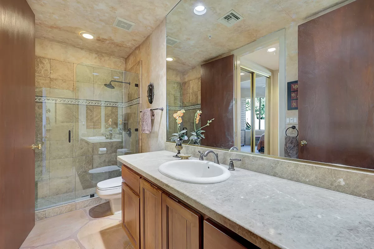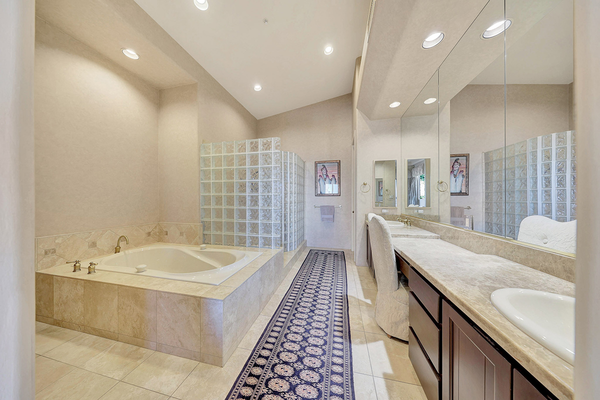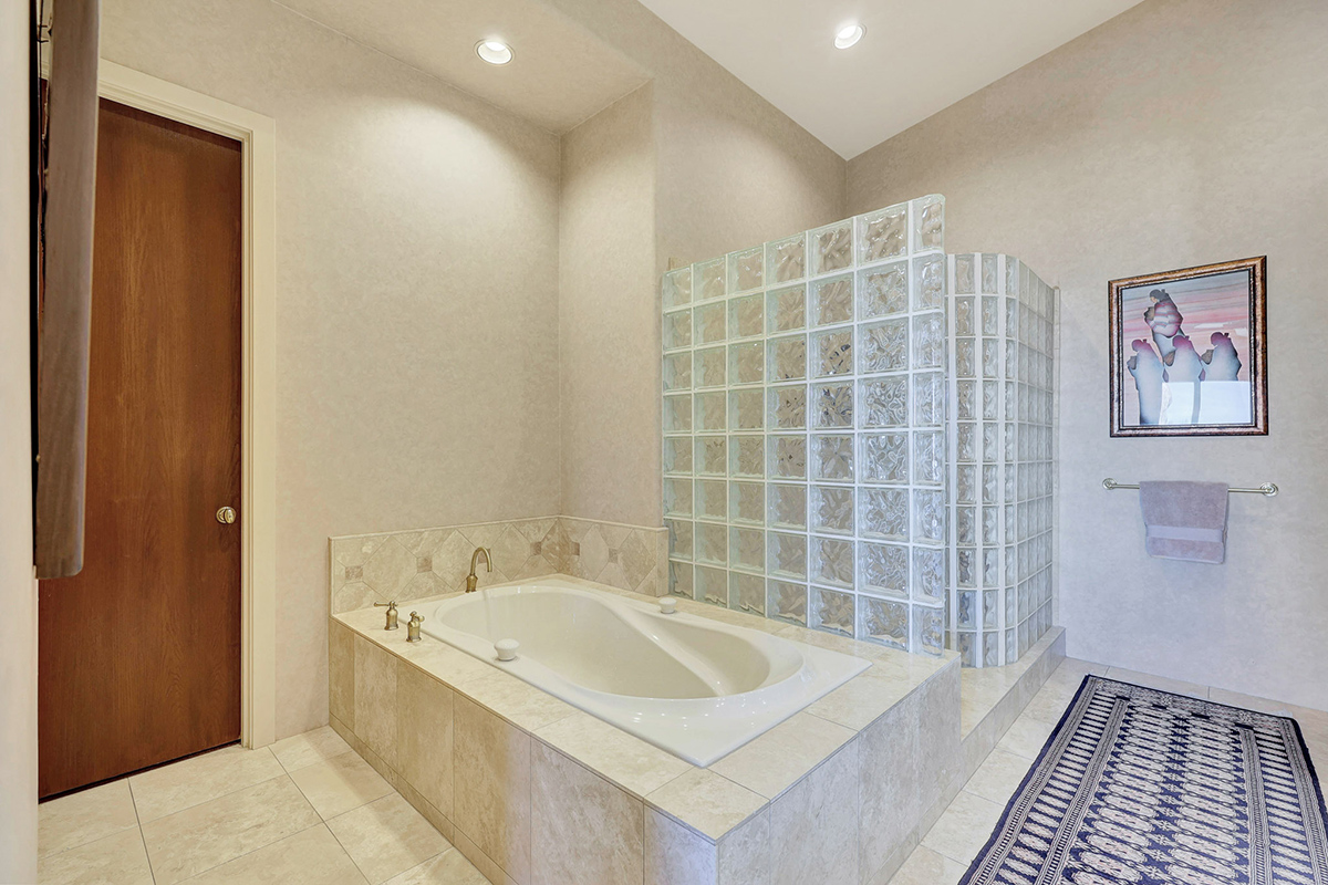 The primary suite features backyard access through a custom glass and metal door, along with a spa-like bathroom offering a soaking tub, dual vanities, a separate shower, a private water closet, and a spacious walk-in closet. A split junior suite with dual closets and an ensuite bath is ideal for guests or in-laws, while a third guest bedroom and a private office share the home’s third bathroom.