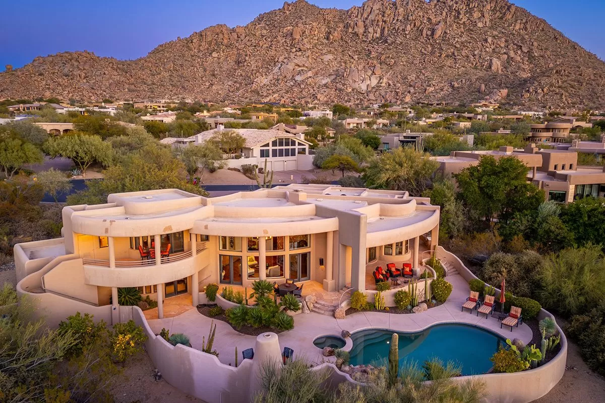 Nestled within the exclusive gated community of Windy Walk Estates at Troon Village, this exceptional home offers a rare and sought-after location custom-built by Shiloh Homes and designed by Lee Hutchinson. Situated on the 8th tee box of Troon Country Club’s private course, this property boasts breathtaking city light, Pinnacle Peak, and double fairway views from the backyard, while the front showcases the majestic Troon Mountain. The positioning of the home has been thoughtfully designed to provide an idyllic setting for both relaxation and entertainment.
