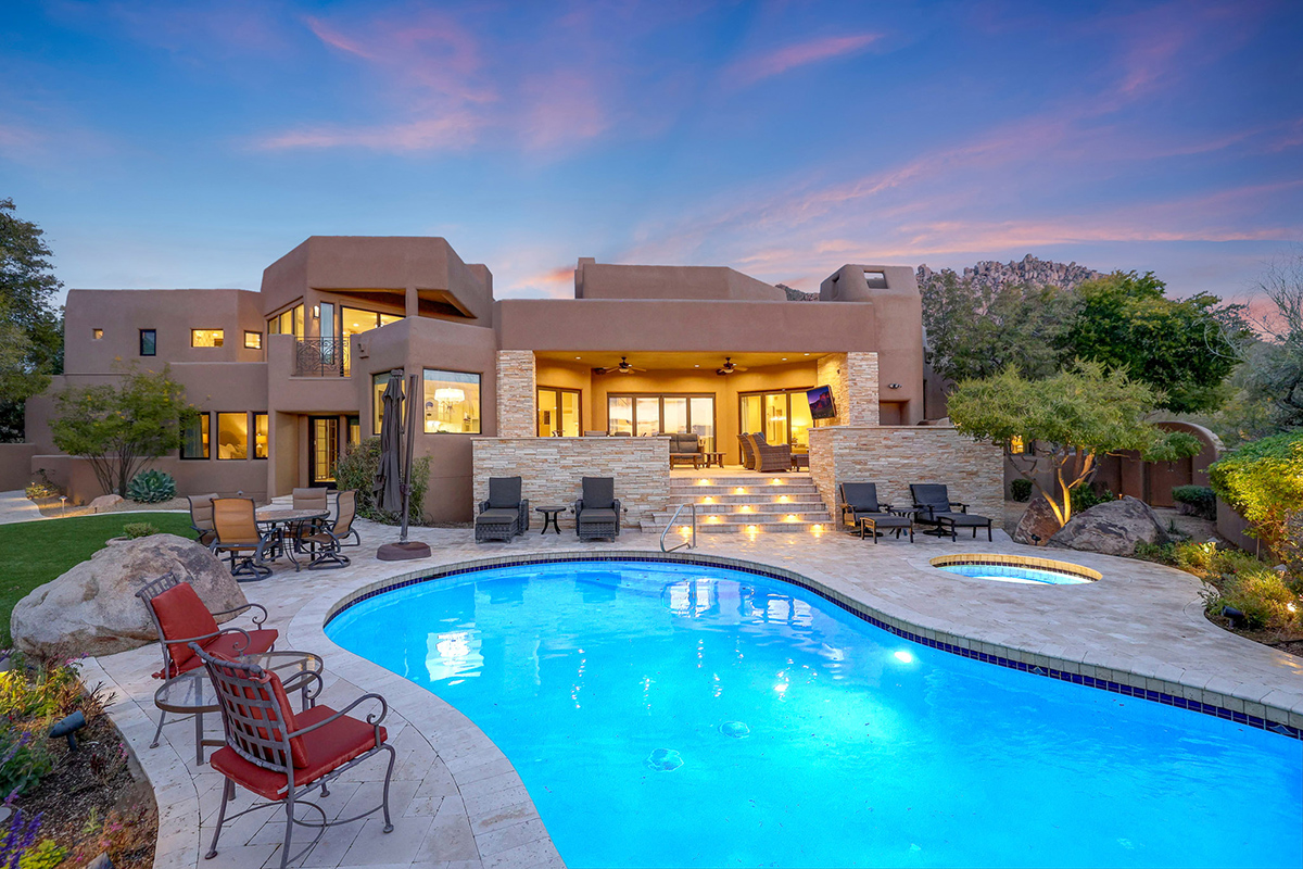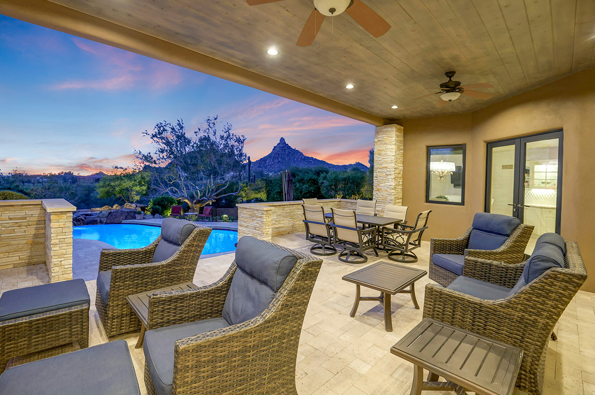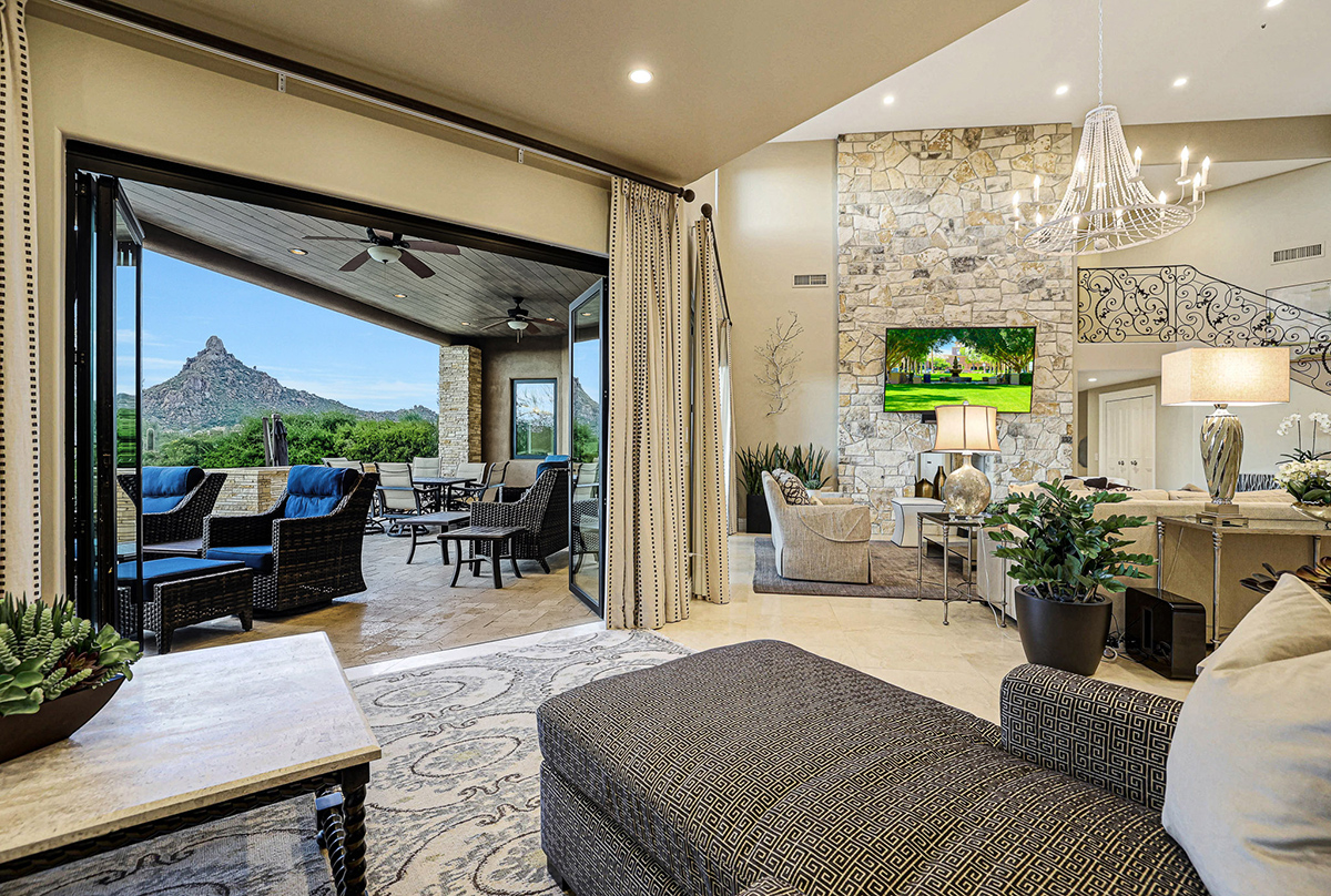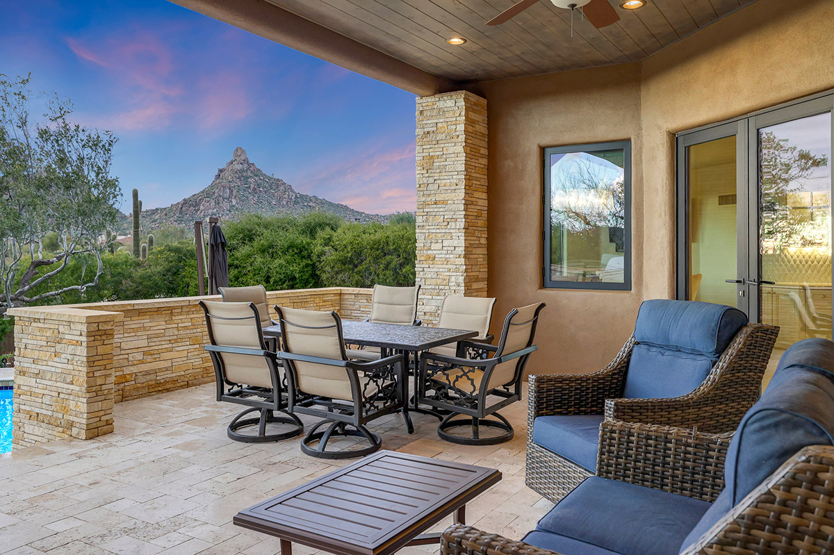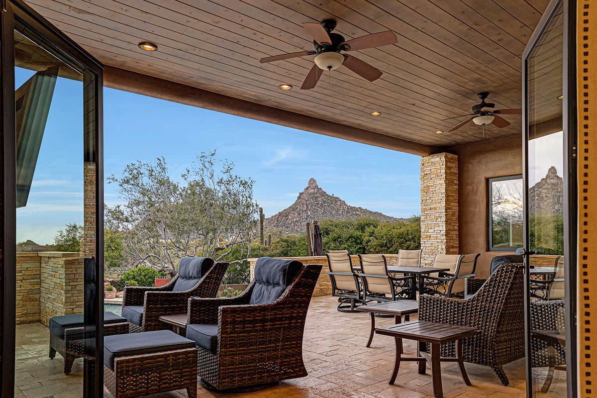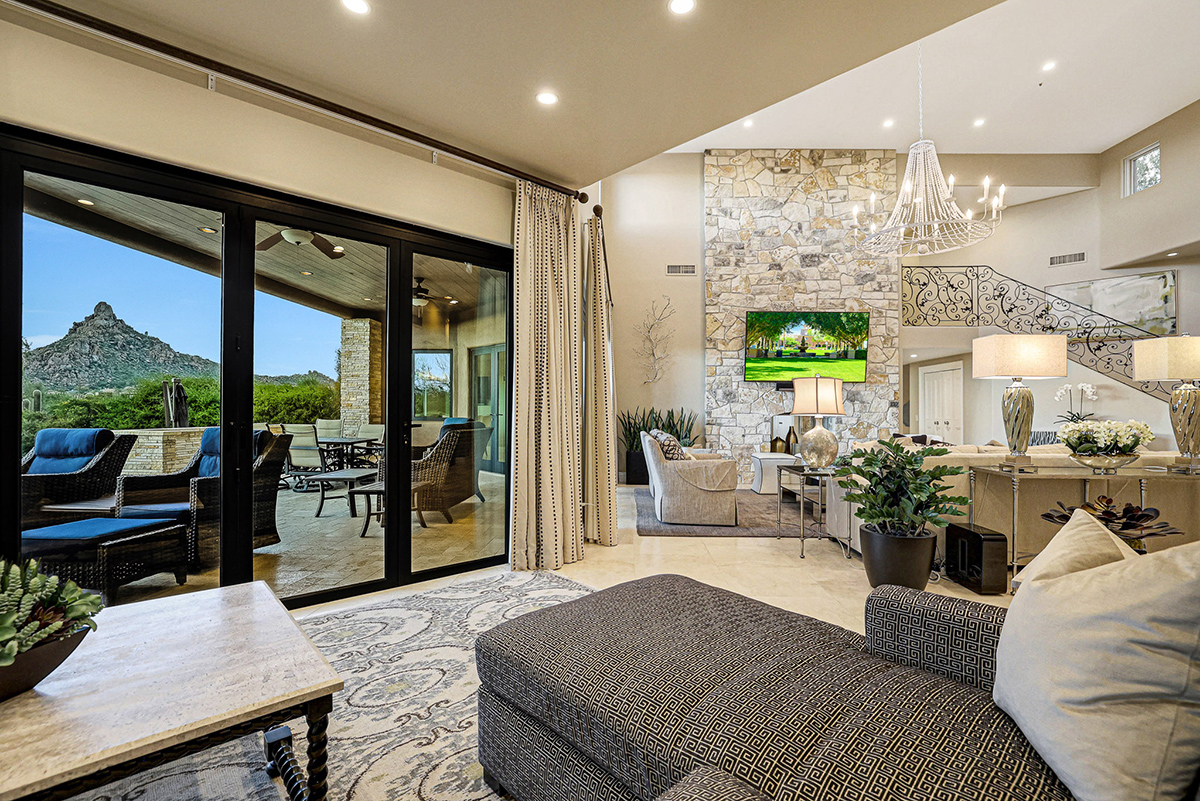 Experience seamless living with accordion-style doors in the great room, opening up the space to the outdoors and flooding the home with natural light. A dramatic staircase, stone-clad centerpiece fireplace, and adjacent den create a welcoming ambiance, while clerestory windows and a private alcove offer versatility for office space or additional storage. Retreat to the upstairs primary suite, boasting a private balcony deck with city, golf (8th tee box of Troon Country Clubs private course), and mountain views, along with dual vanities, walk-in closets, and a spacious walk-in shower in the ensuite bathroom.
