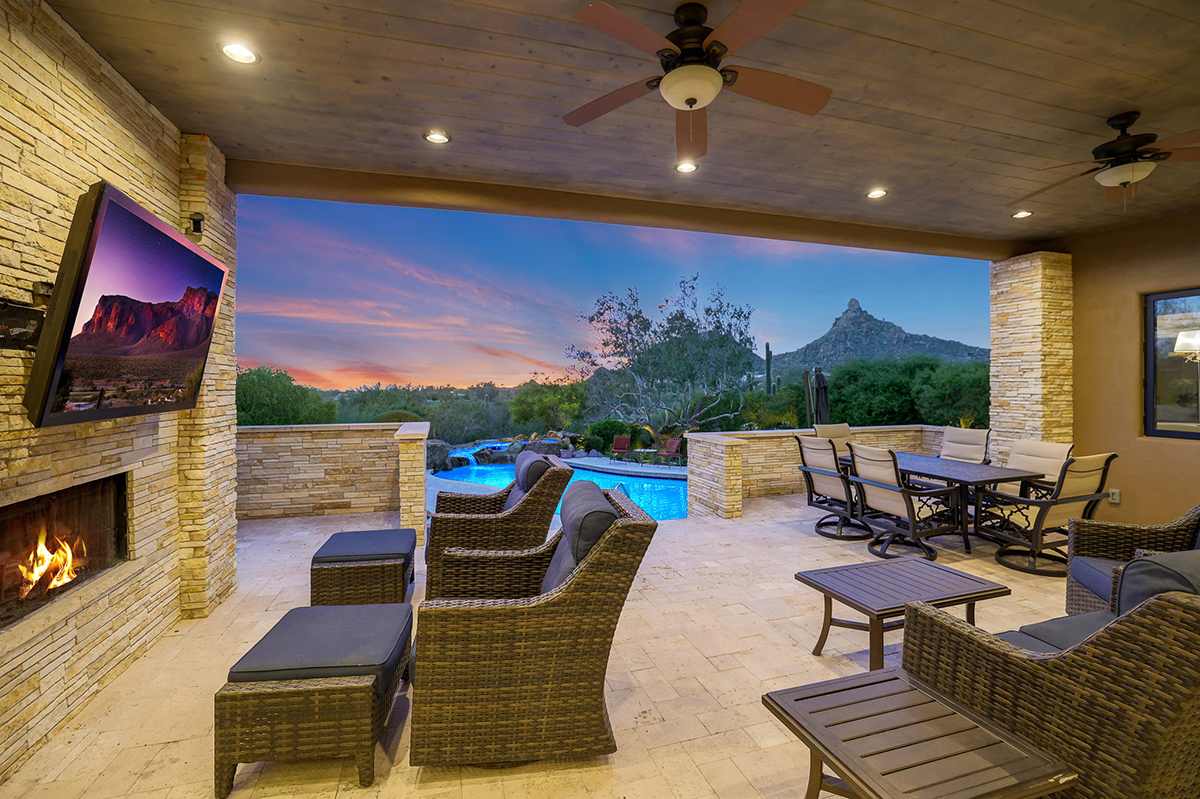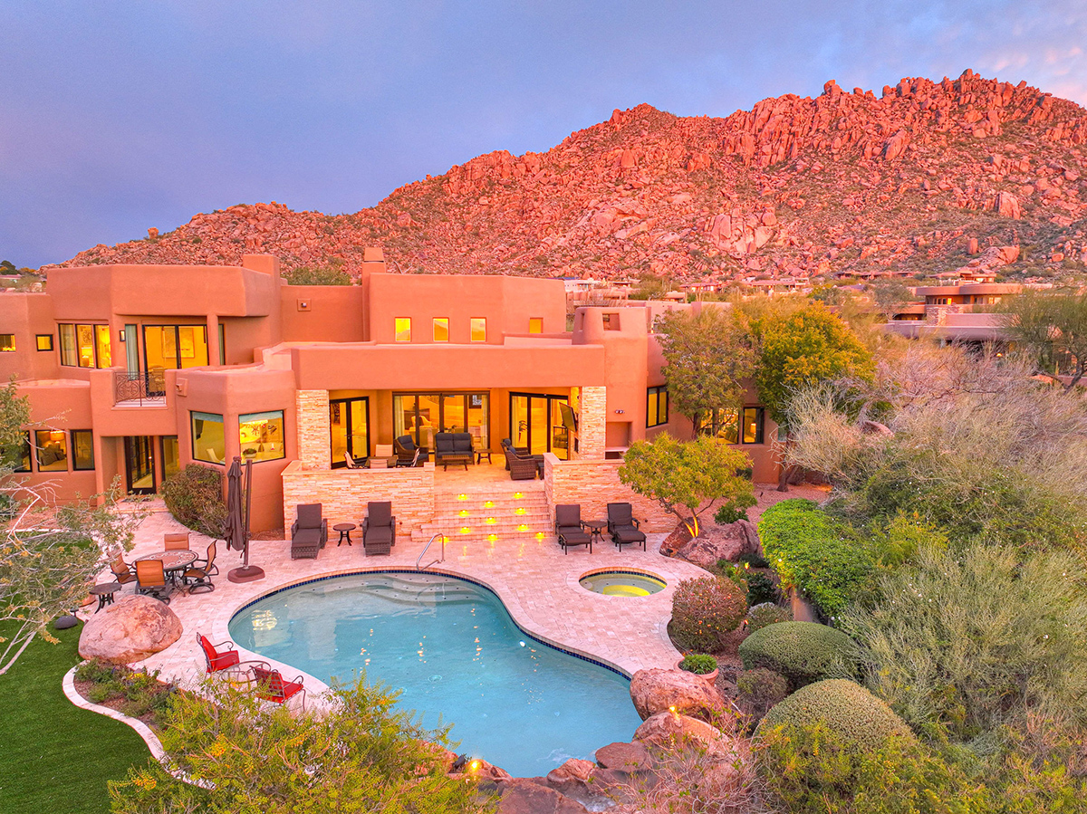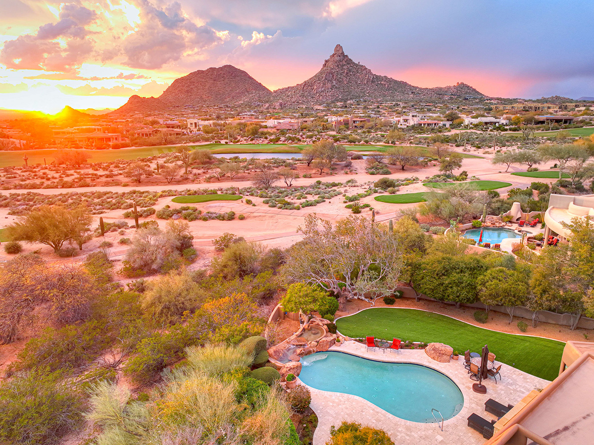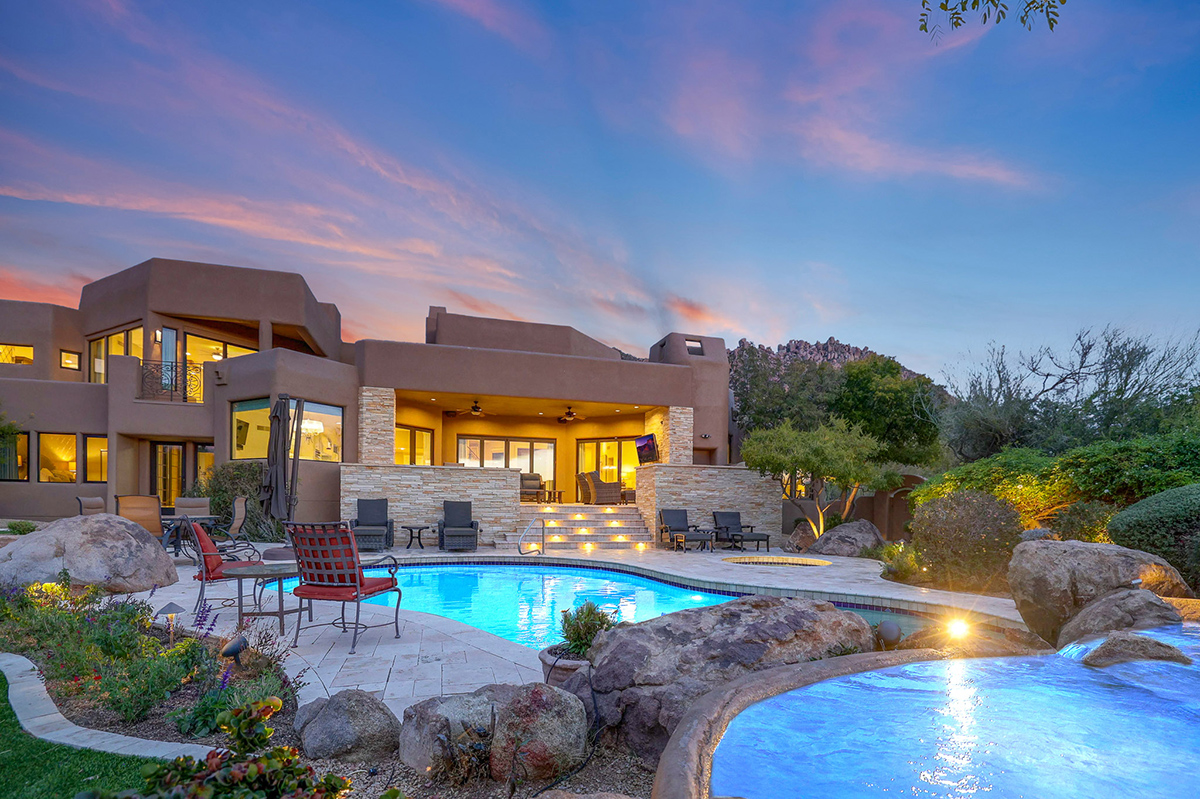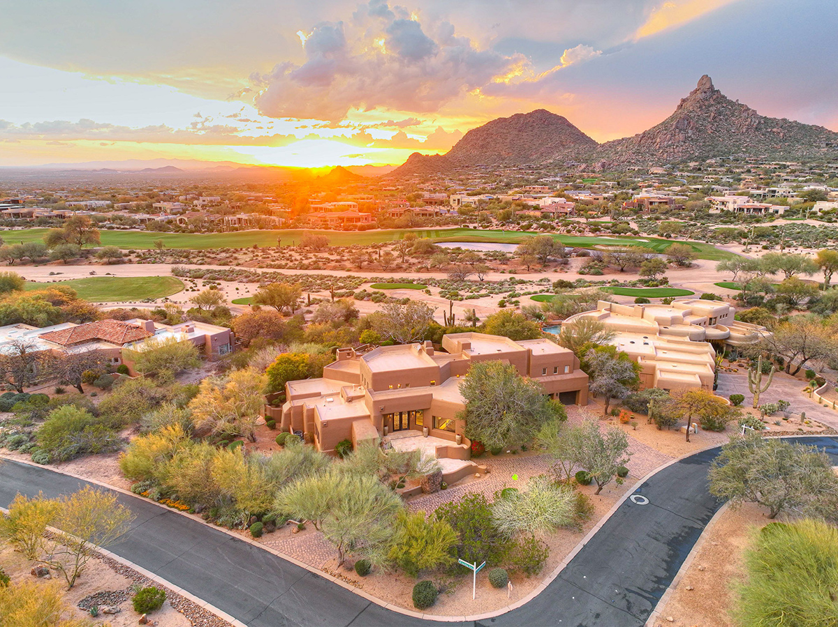 Experience seamless living with accordion-style doors in the great room, opening up the space to the outdoors and flooding the home with natural light. A dramatic staircase, stone-clad centerpiece fireplace, and adjacent den create a welcoming ambiance, while clerestory windows and a private alcove offer versatility for office space or additional storage. Retreat to the upstairs primary suite, boasting a private balcony deck with city, golf (8th tee box of Troon Country Clubs private course), and mountain views, along with dual vanities, walk-in closets, and a spacious walk-in shower in the ensuite bathroom.