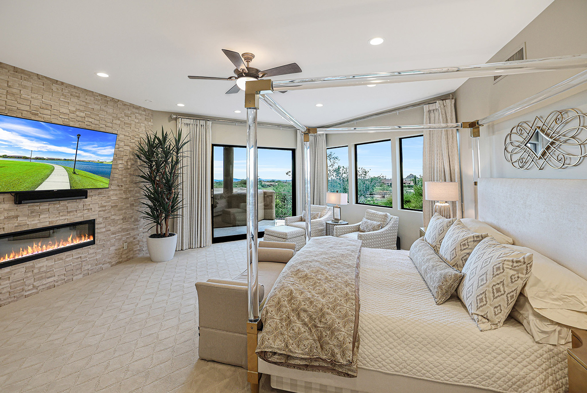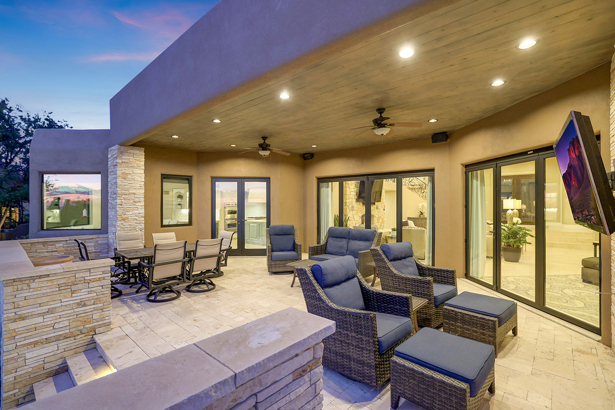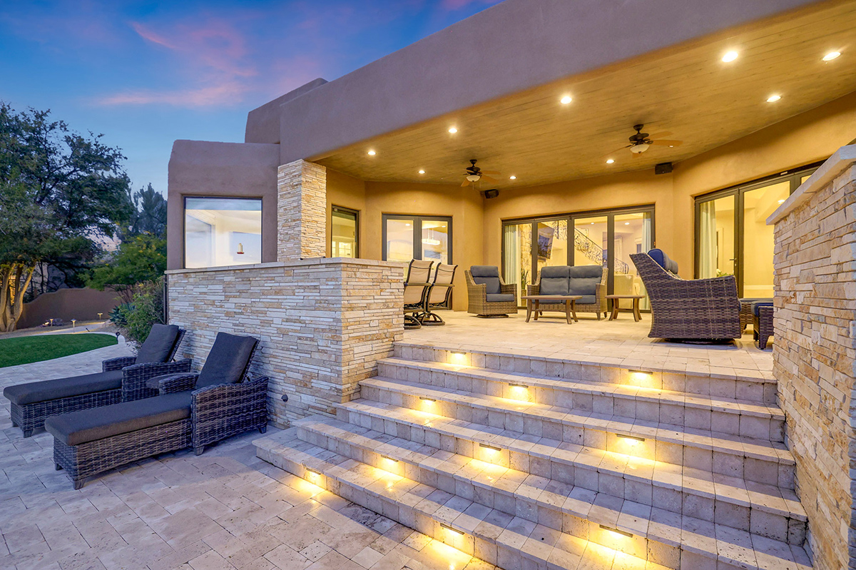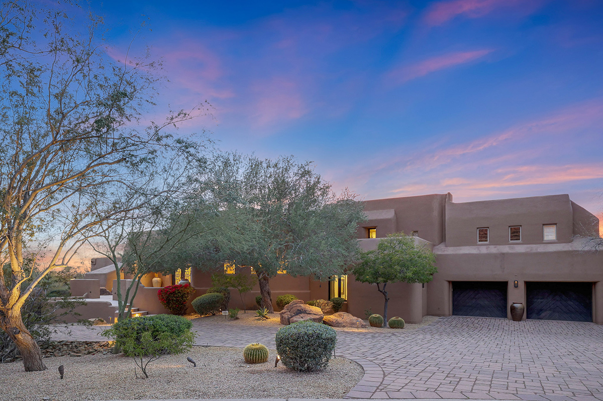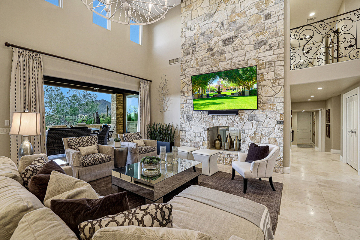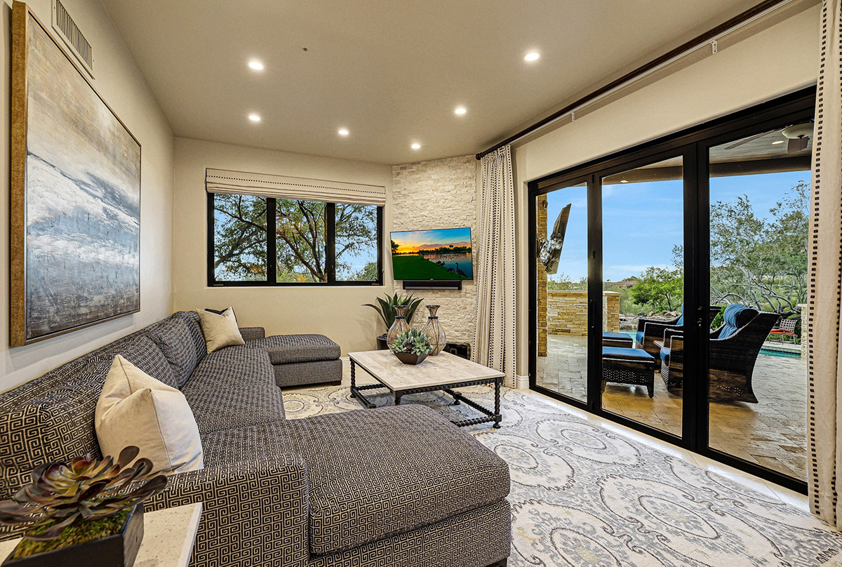 Experience seamless living with accordion-style doors in the great room, opening up the space to the outdoors and flooding the home with natural light. A dramatic staircase, stone-clad centerpiece fireplace, and adjacent den create a welcoming ambiance, while clerestory windows and a private alcove offer versatility for office space or additional storage. Retreat to the upstairs primary suite, boasting a private balcony deck with city, golf (8th tee box of Troon Country Clubs private course), and mountain views, along with dual vanities, walk-in closets, and a spacious walk-in shower in the ensuite bathroom.