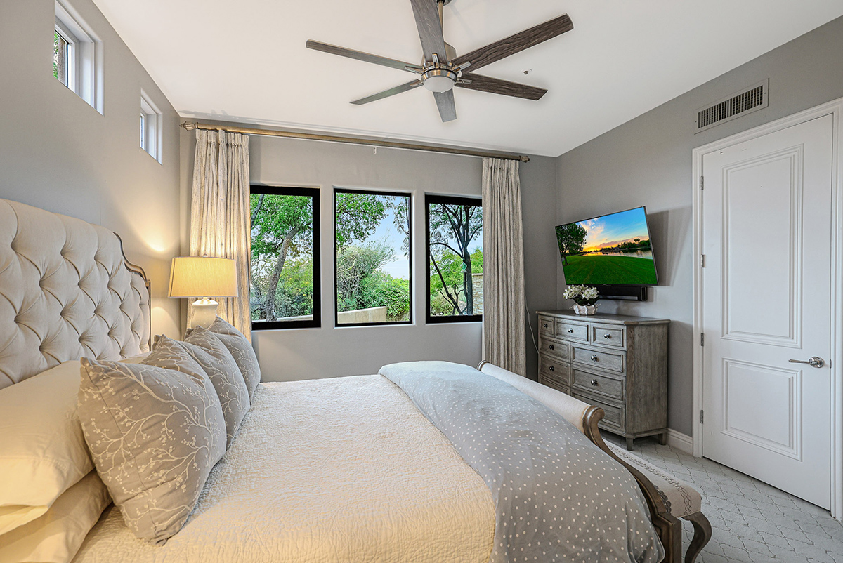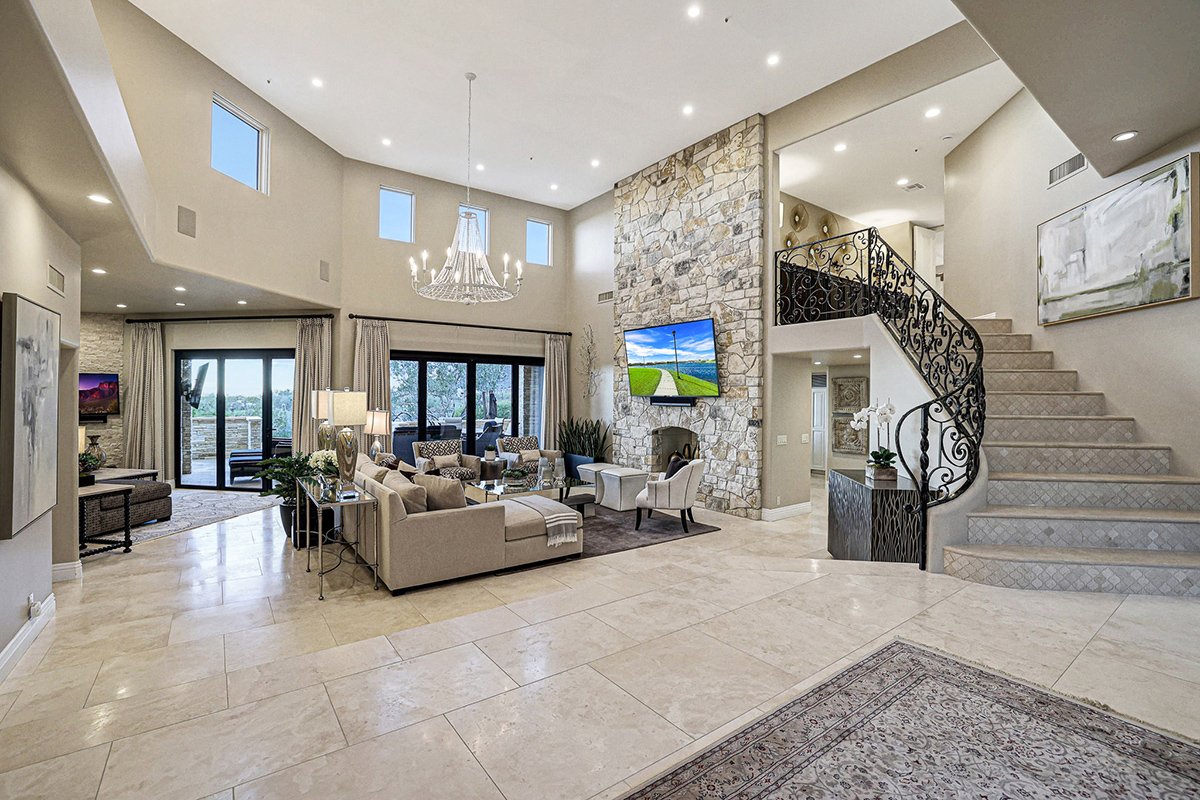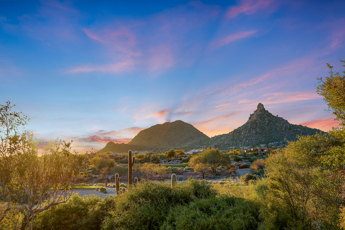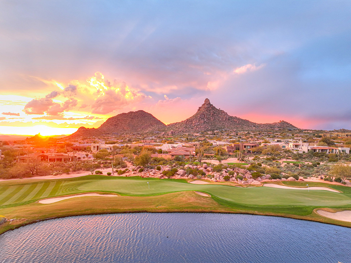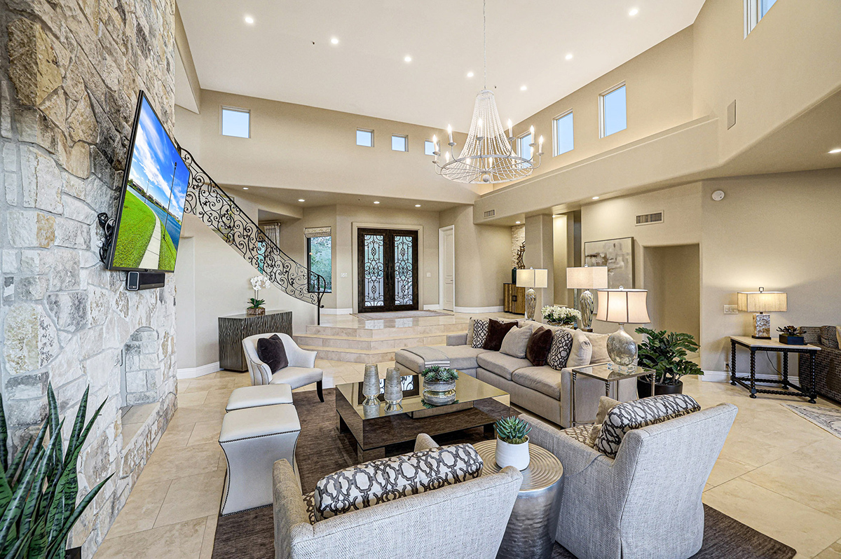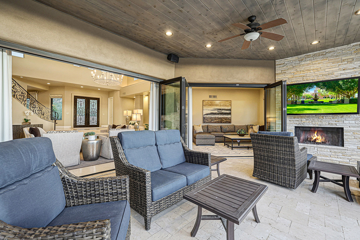 Experience seamless living with accordion-style doors in the great room, opening up the space to the outdoors and flooding the home with natural light. A dramatic staircase, stone-clad centerpiece fireplace, and adjacent den create a welcoming ambiance, while clerestory windows and a private alcove offer versatility for office space or additional storage. Retreat to the upstairs primary suite, boasting a private balcony deck with city, golf (8th tee box of Troon Country Clubs private course), and mountain views, along with dual vanities, walk-in closets, and a spacious walk-in shower in the ensuite bathroom.