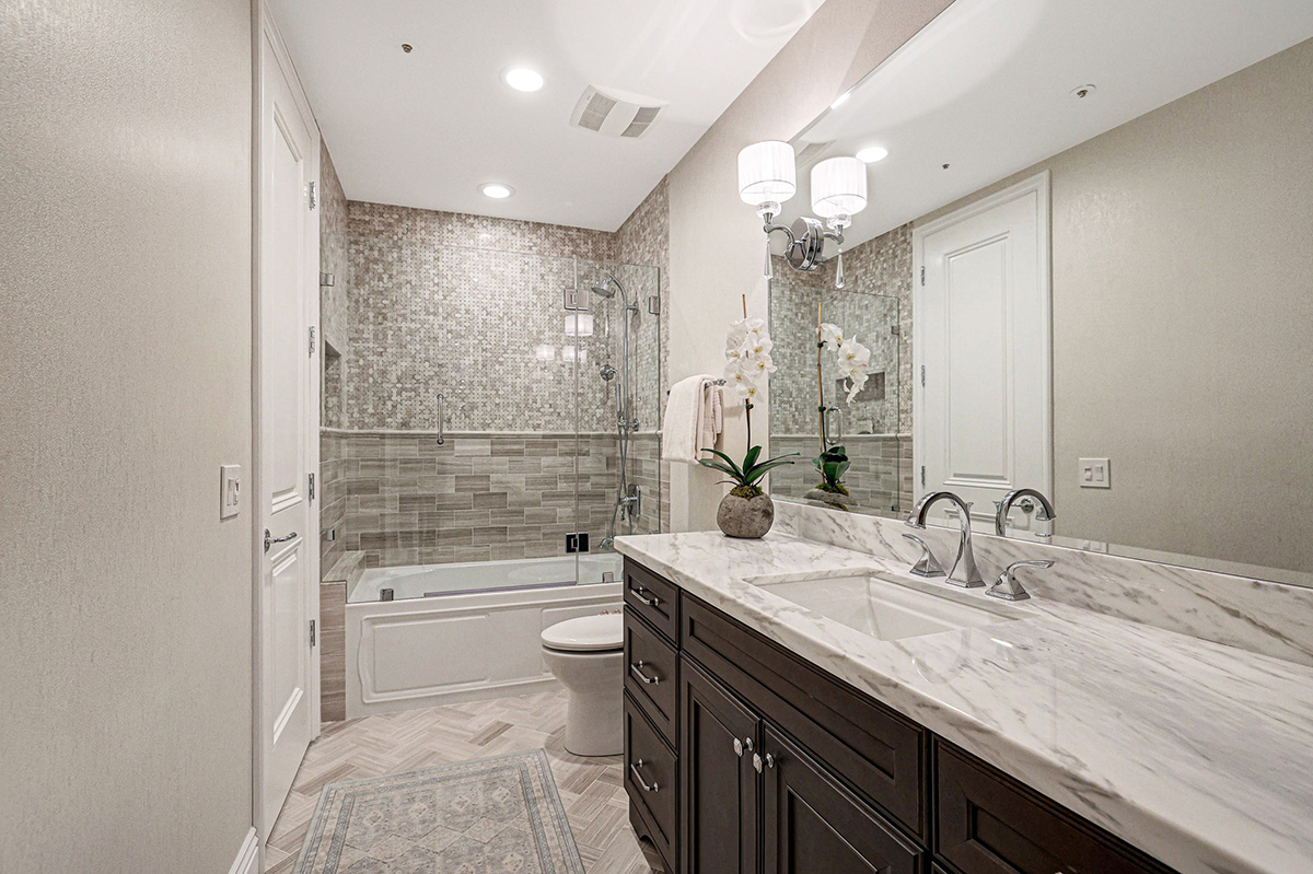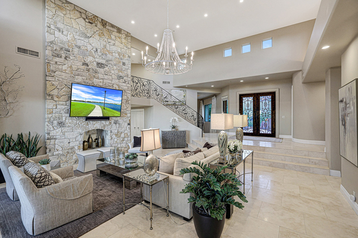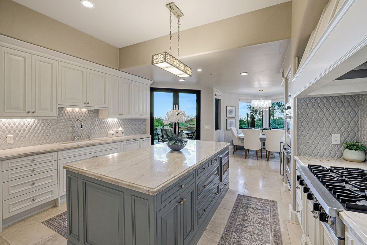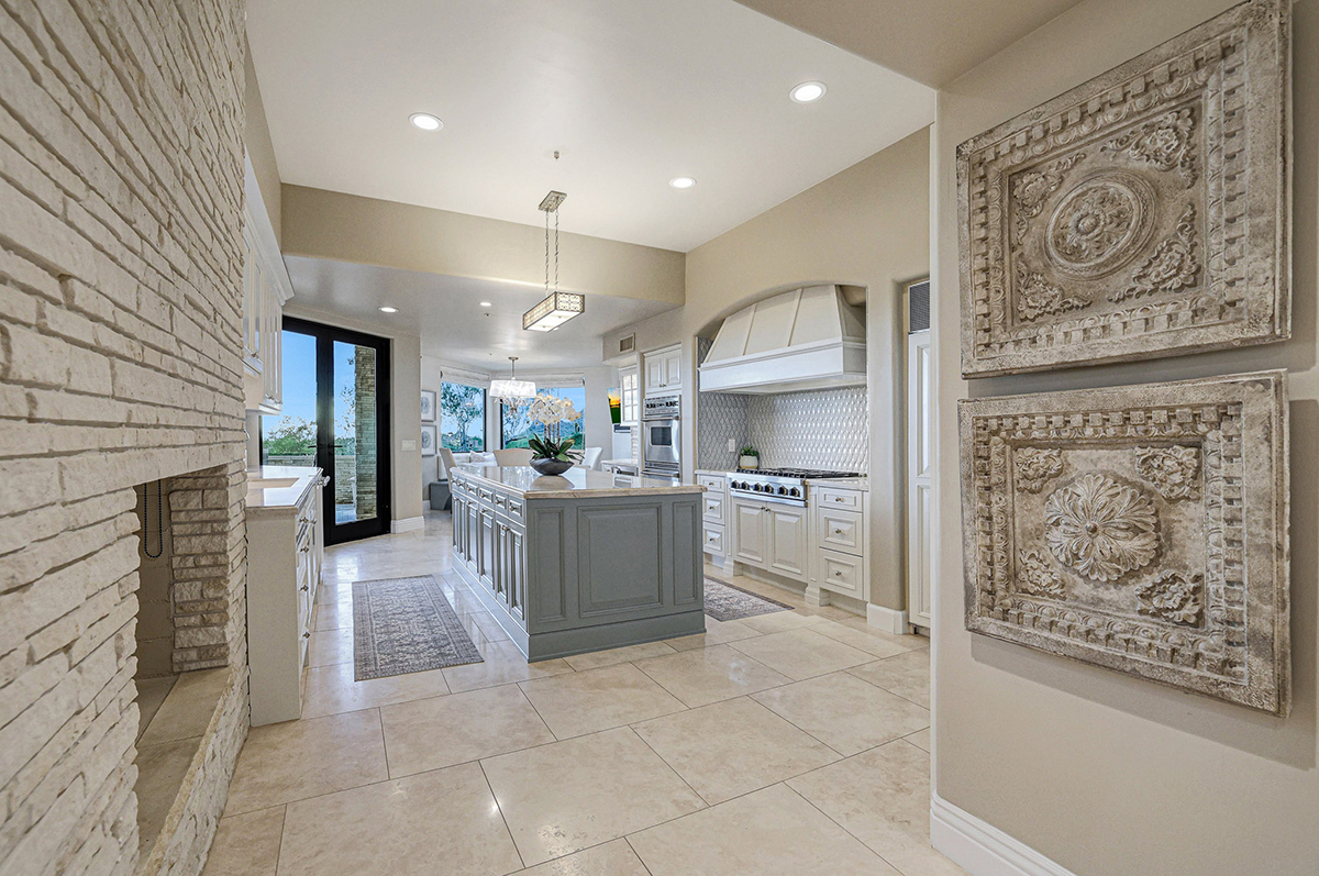 Step into serenity as you lounge under the covered patio adorned with stacked stone accents, a cozy fireplace, and a built-in barbecue. Descend into tranquility as the tiered yard leads you to a sparkling pool and spa, complete with a mesmerizing rock waterfall and travertine hardscape surround, offering a blissful oasis against the backdrop of the desert landscape. Inside, you will find a remodeled interior completed in 2017 boasting on-trend finishes including high-end quality stonework throughout from a Chicago-based Eastern European craftsman.