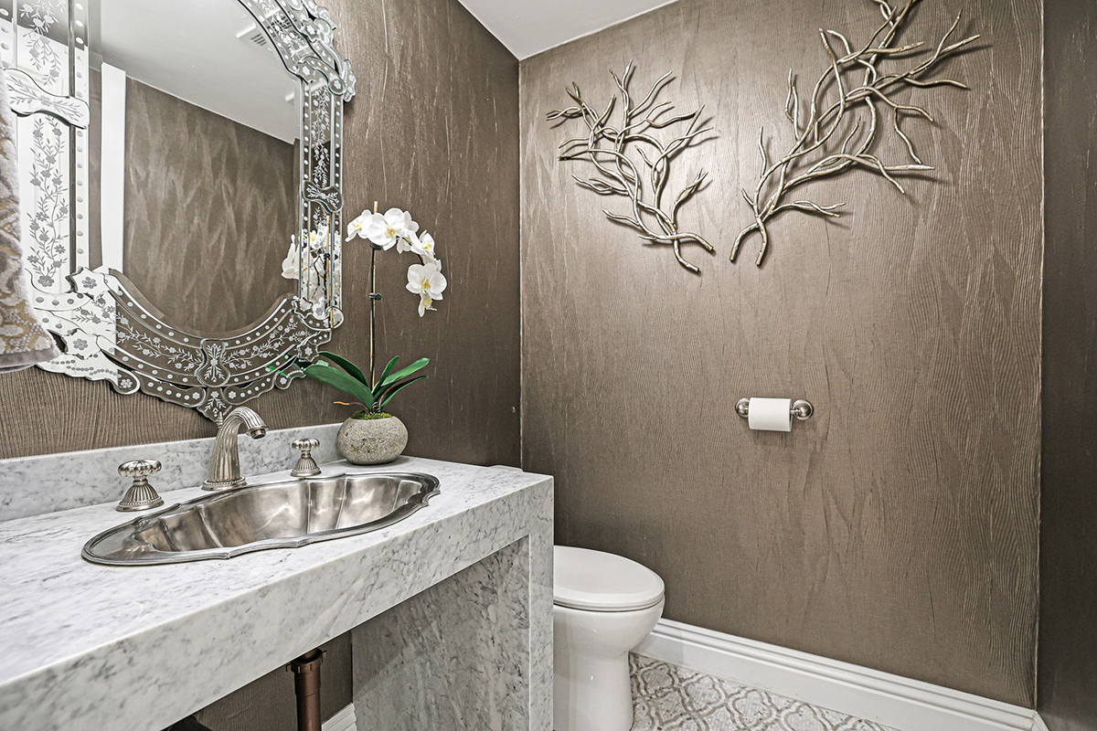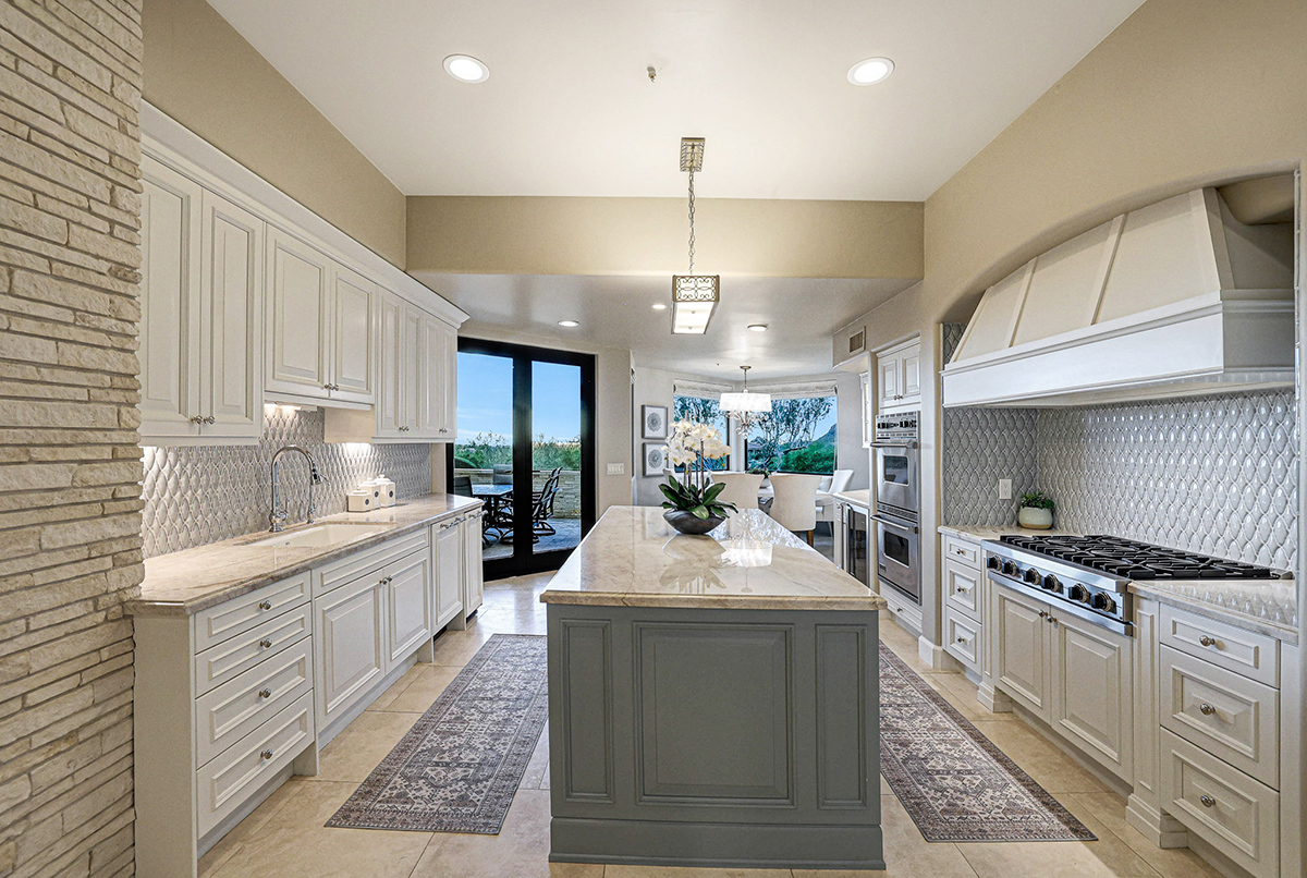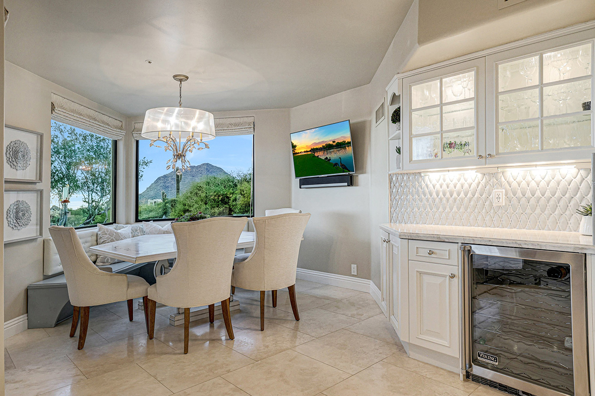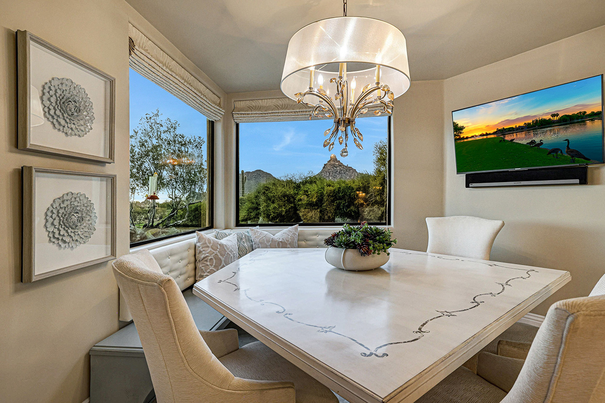 The French country-inspired kitchen exudes charm with custom white cabinetry, delicate mosaic backsplash, stone counters, Subzero refrigerators, complemented by stainless steel appliances including a Wolf gas cooktop and two wall ovens. Enjoy intimate meals in the attached breakfast nook with corner view windows, or entertain guests in the formal dining room with up-close views of Troon Mountain.