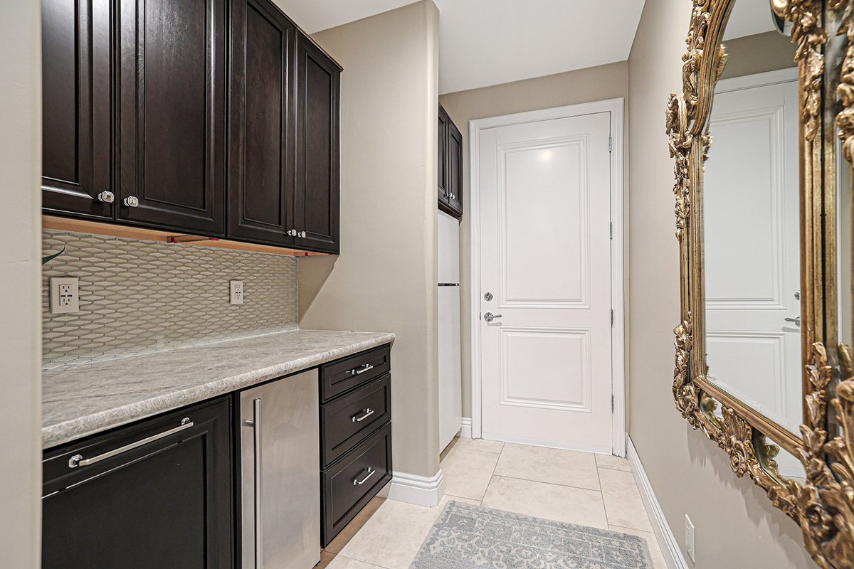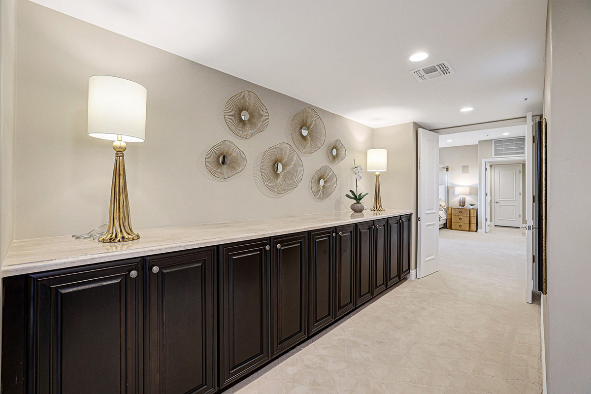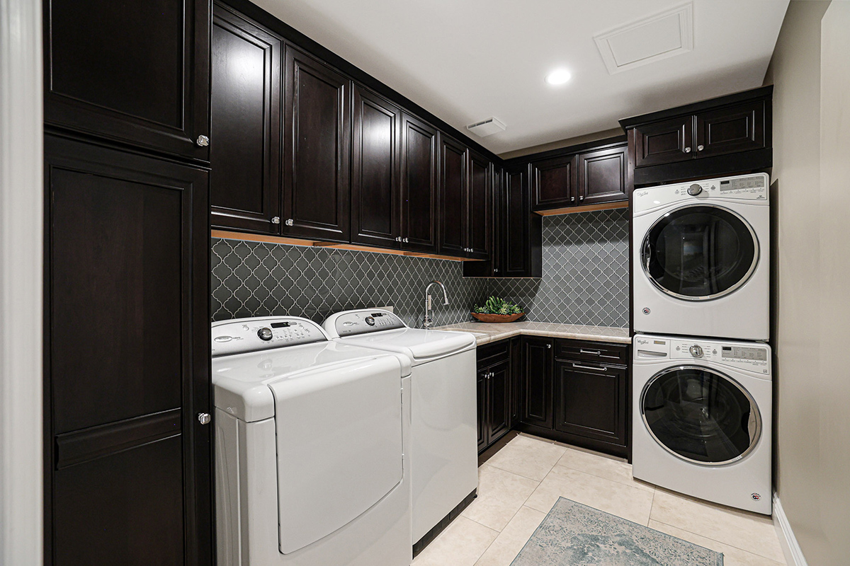 With four additional bedrooms, including two ensuites, a third bedroom adjacent to a bath, and the fourth with a private den/living space and adjacent bath, perfect for in-law quarters. The laundry room has beautifully stained cabinetry, two washers, two dryers, and a prep sink. The owners entry off the two-car garage (with storage closet) has a touchdown station with cabinets and countertop, refrigerator, trash drawers, and an ice maker.